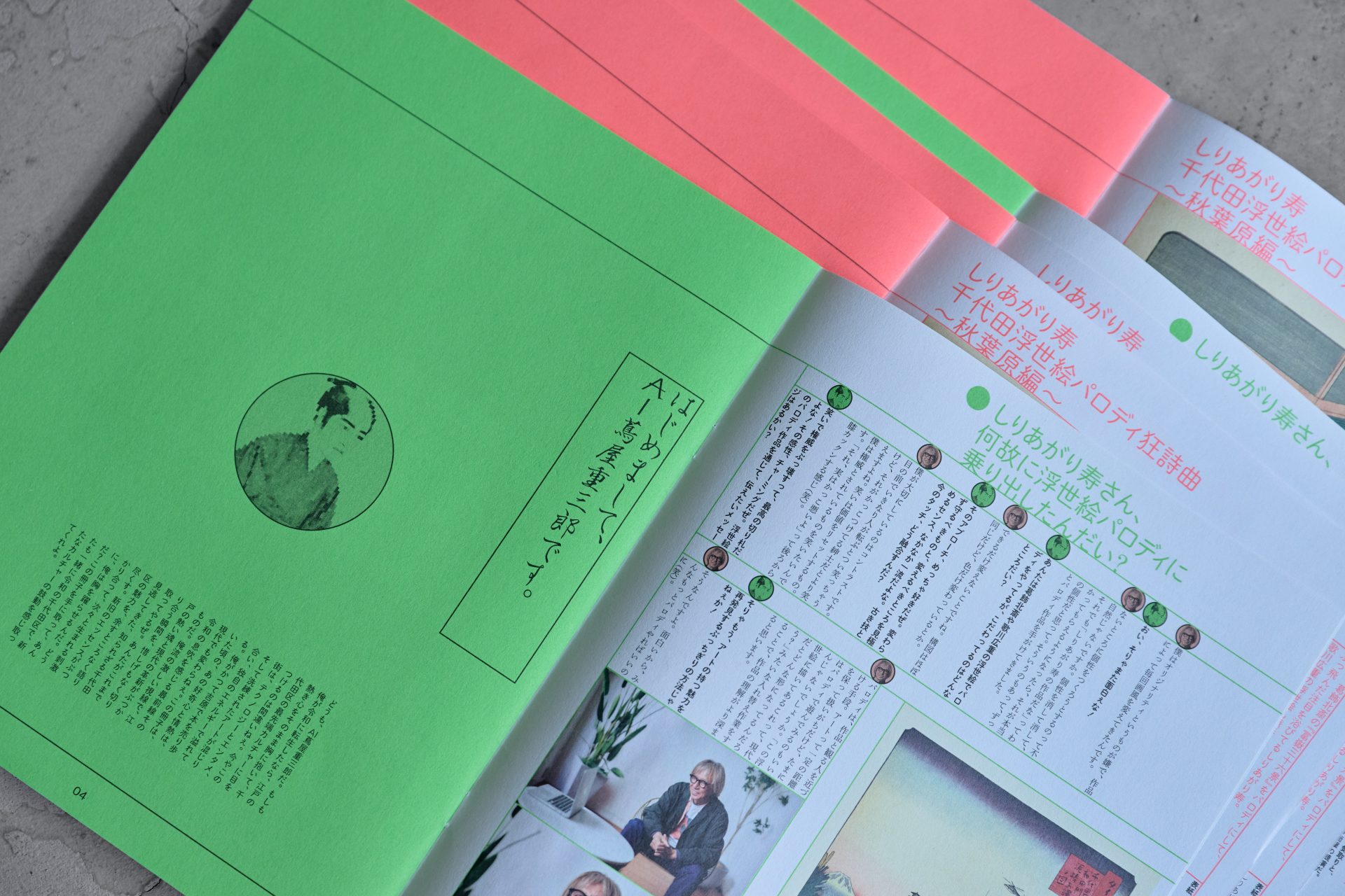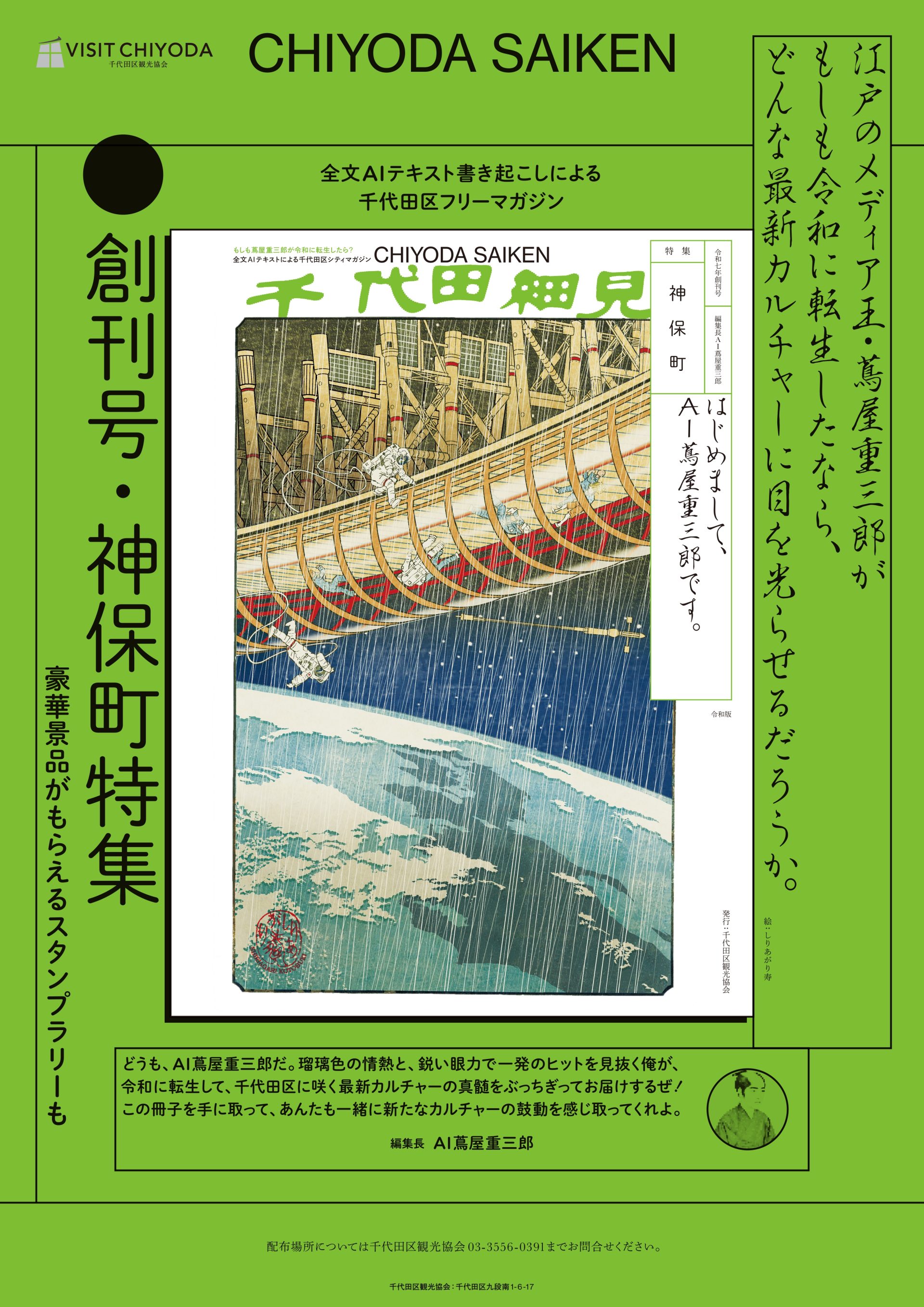 蔦屋重三郎に関する文献や作品、人物像・思想をもとにAIを学習・開発し、「AI蔦屋重三郎」を編集長として設定。AIの開発にあたっては、NHK大河ドラマ「べらぼう~蔦重栄華乃夢噺~」をはじめ、数多くの作品で時代考証を手がける歴史作家・時代考証家の山村竜也氏が監修を務めた。こうして構築したAI蔦屋重三郎を編集長に据え、「もしも蔦屋重三郎が令和に転生したら」という発想から、千代田区の文化や街の魅力を紹介するマガジンを制作した。表紙には、漫画家・現代美術家のしりあがり寿氏による日本初公開のパロディ浮世絵を起用し、誌面の世界観を象徴するビジュアルとして展開した。