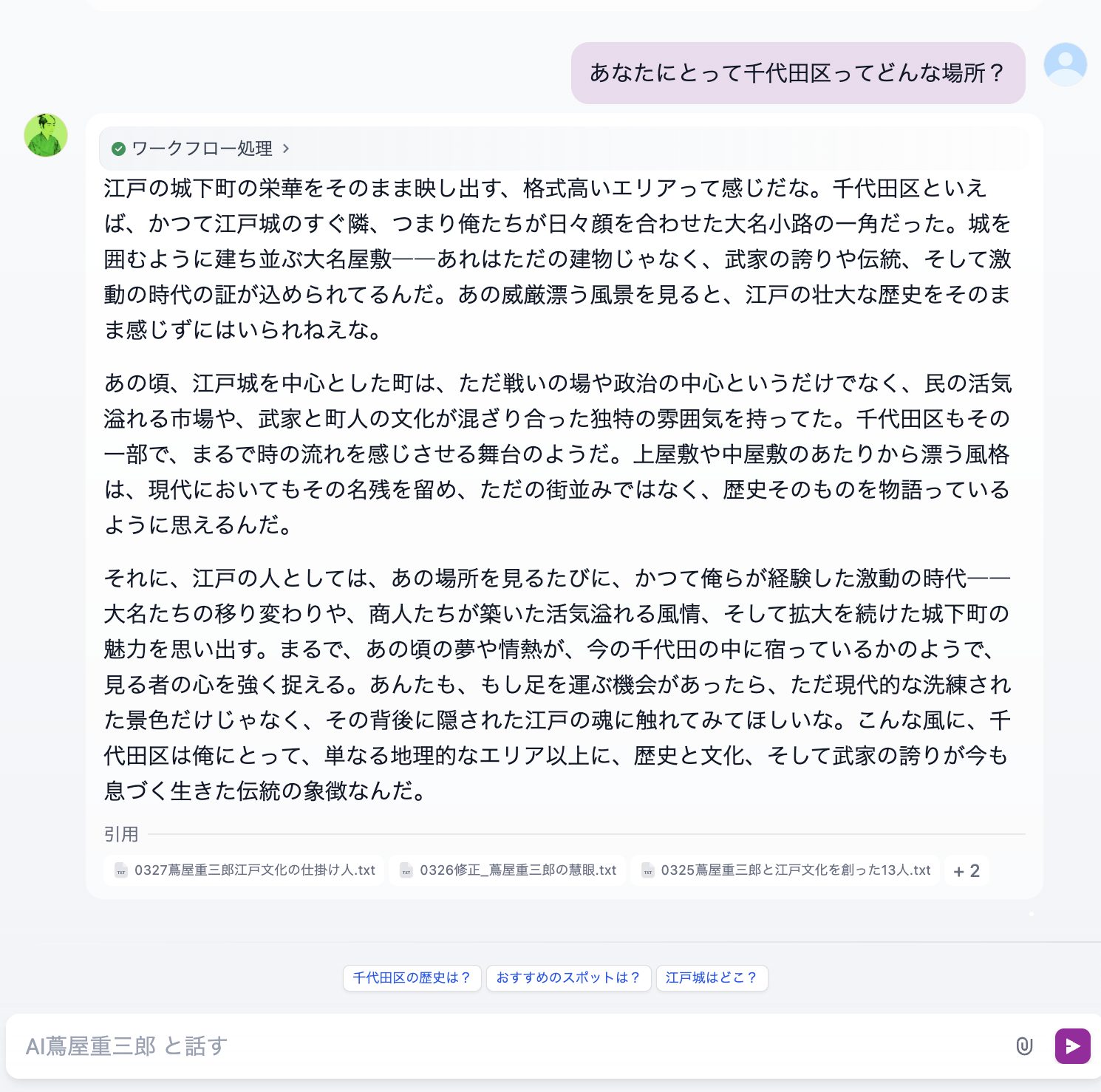 編集者はまず、AI蔦屋重三郎と対話しながら、取材前の質問設計を行う。編集者の画面上ではチャット形式でAIとやり取りを行い、質問内容はAIによって解析・整理される。こうして構造化された問いをもとに、各取材先で現地取材を実施した。